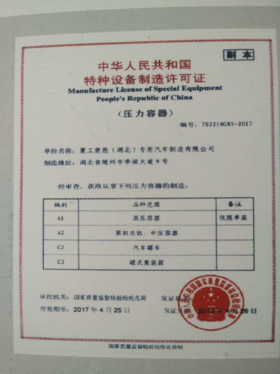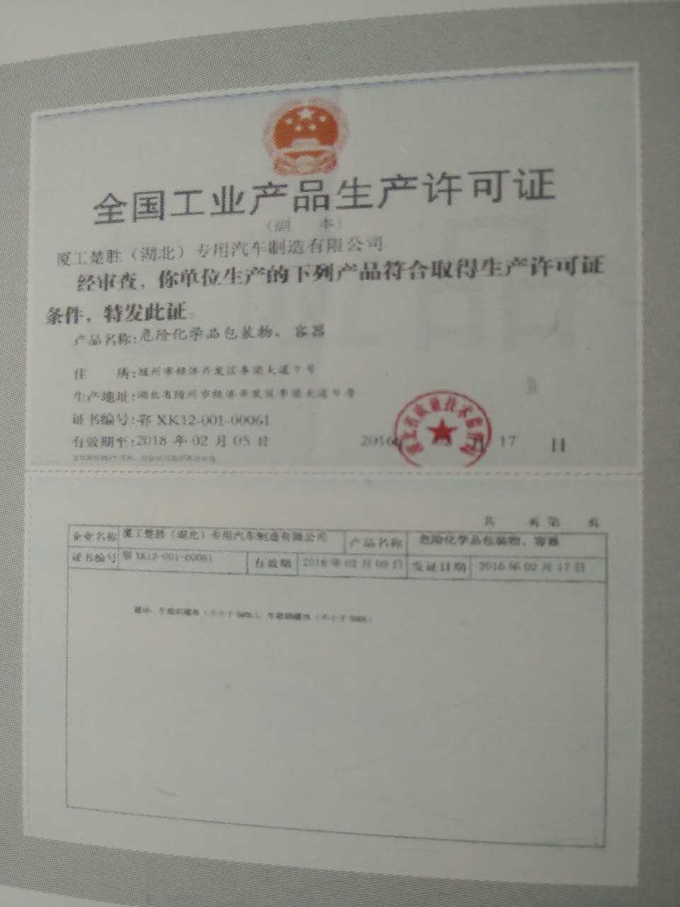 油罐車生產(chǎn)企業(yè)需要那些資質(zhì) 油罐車是危險品運輸里面最常用的車輛,大到國家項目,小到鄉(xiāng)村,你都能看到它的身影,它與我們的生活息息相關(guān)。 今天我們就以全國最大的油罐車生產(chǎn)企業(yè)之一廈工楚勝(湖北)專用汽車制造有限公司為例來說明一下油罐車生產(chǎn)企業(yè)的資質(zhì): 廈工楚勝作為全國性的大公司,它所獲得的榮譽是比較多的, 《全國創(chuàng)新型企業(yè)》 《中國馳名商標(biāo)》 《量管理體系》 《環(huán)境管理體系》等這些是公司基本要求。但作為油罐車生產(chǎn)企業(yè)就必須具有 《全國工業(yè)產(chǎn)品生產(chǎn)許可證(危險化學(xué)品)》