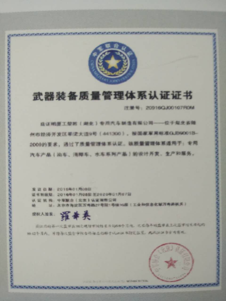 前段時間公司又迎來了驕傲的成績獲得向軍方出售產(chǎn)品的權(quán)利,在解放軍后勤總部掛號的企業(yè) 《武器裝備質(zhì)量管理體系認(rèn)證證書>